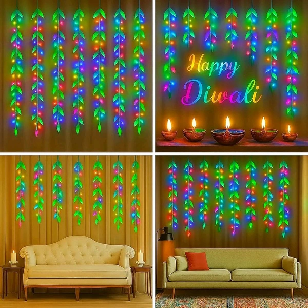 🌿 Artificial Leaf Curtain Lights with Vibrant Multicolor Glow – Lush green artificial leaves paired with bright multicolor RGB fairy string lights create a lively, festive backdrop. Perfect for Diwali decoration for home, Deepawali light displays, weddings, balcony lights, living room wall hanging, and bedroom décor. Adds a soft yet cheerful glow for Diwali ladi light, diwali ladiya, birthday parties, and anniversary decorations.